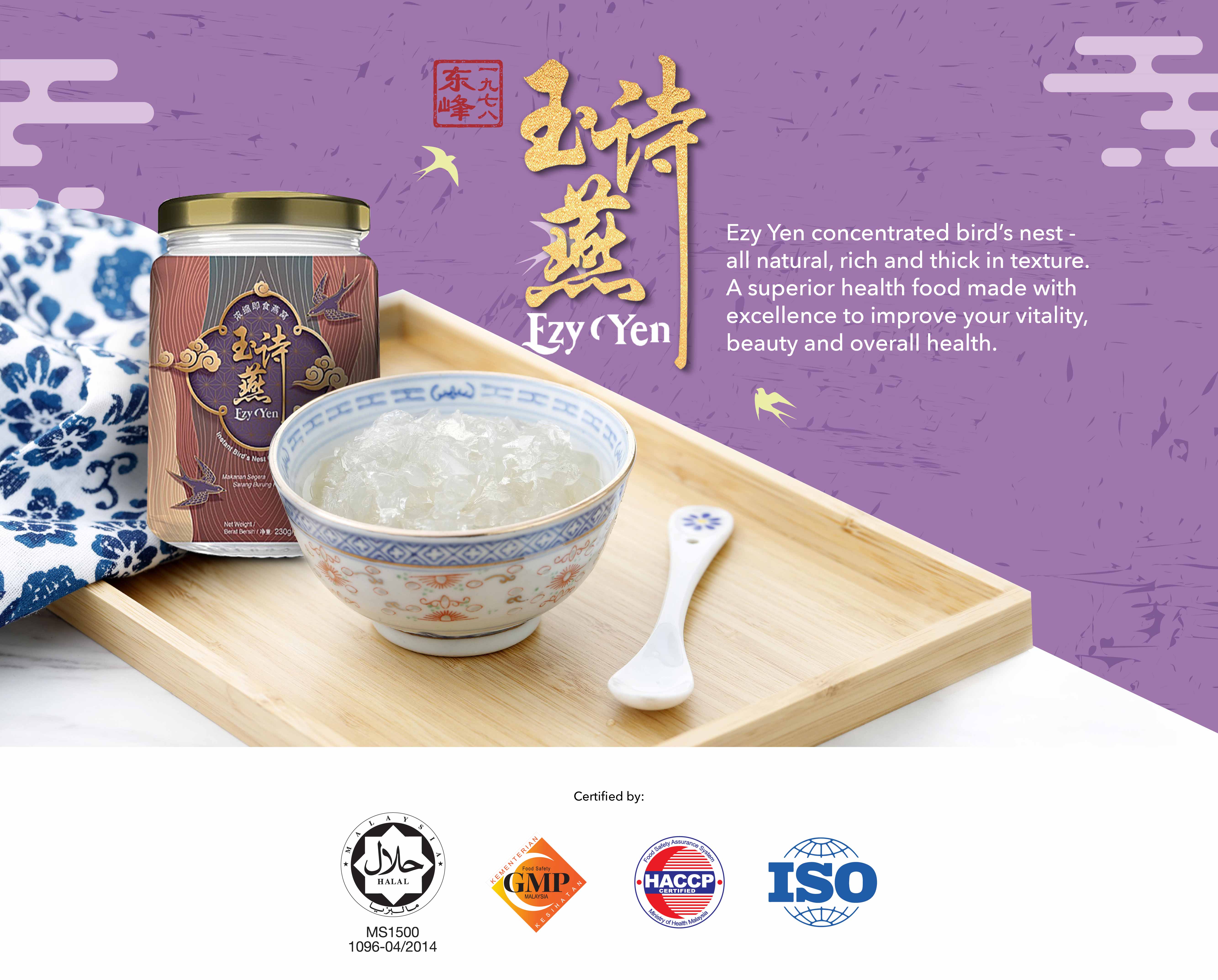 EZY YEN Instant Bird's Nest Concentrate Enjoy the goodness of Birdβs Nest, the EZY way. Ezy Yen is prepared with birdβs nests derived naturally from Golden Thread Swiflets (Apodidae: Collocalia). It is rich in high quality and easily absorbed nutrients. It has been scientifically proven to contain bio-active protein, trace minerals and micro nutrients which are essential to our health. Ezy Yen is manufactured by the latest technology under strict Good Manufacturing Practice (GMP) and HACCP standards. This product is also treated with state-of-the-art high temperature sterilization methods to ensure Ezy Yen is safe, hygienic and of highest quality. Ezy Yen is a truly nourishing food for the whole family. It is so convenient to be taken straight or mixed with your favorite warm or cold drinks.